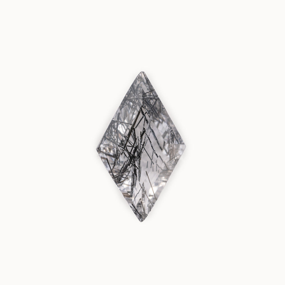• kite shaped tourmaline in quartz is set in a prong + v-end setting