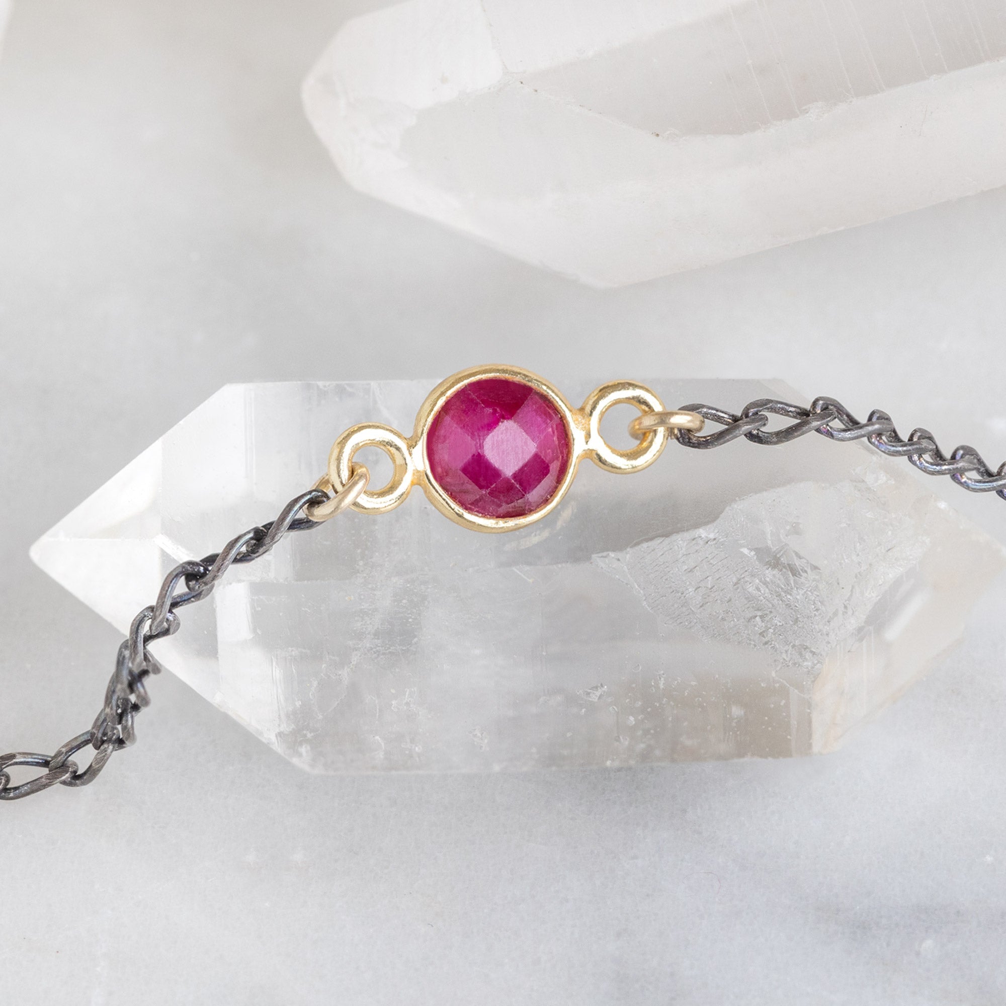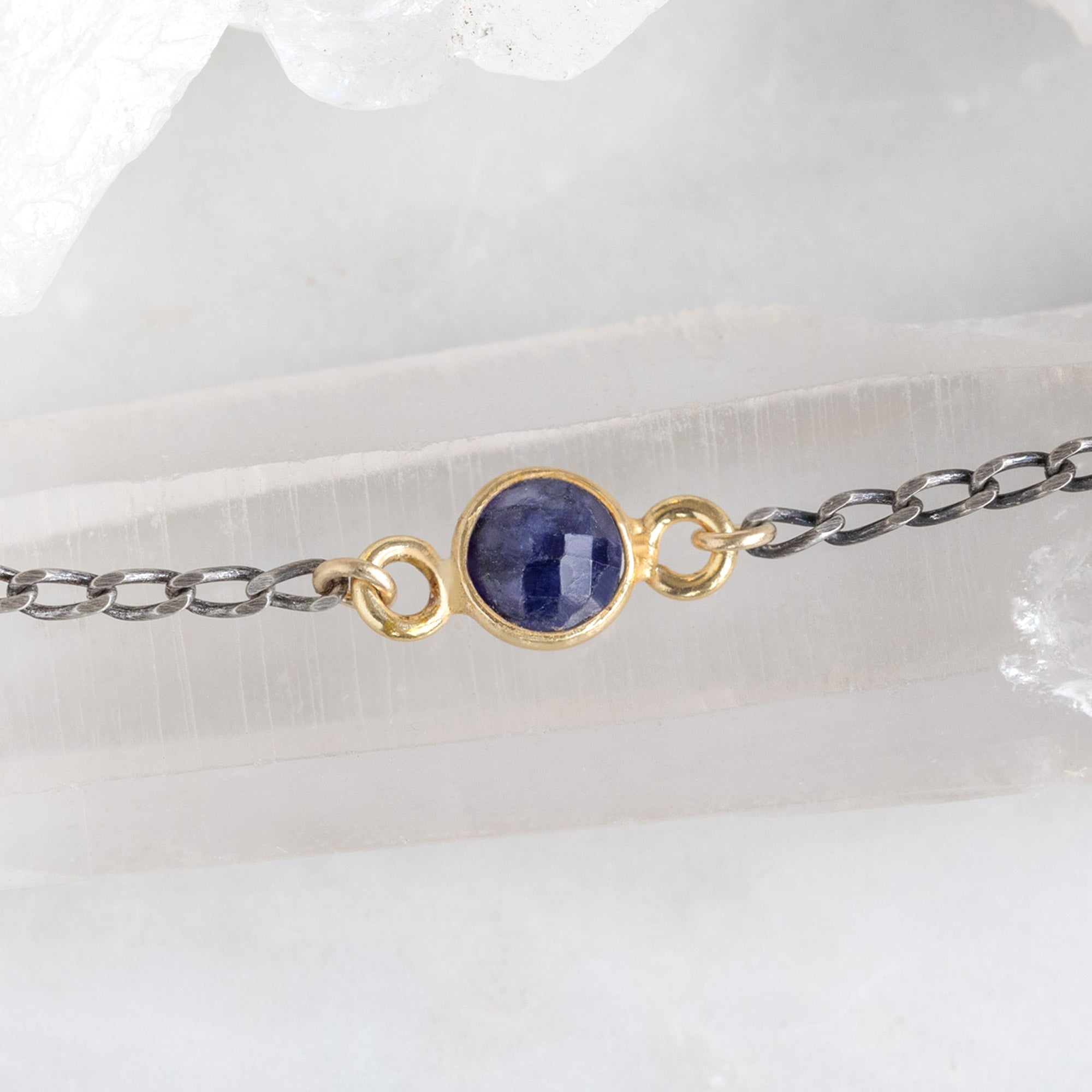 A natural gemstone of your choice is bezel set in gold filled and linked to an oxidized, sterling silver chain to create the perfect mixed metal bracelet.